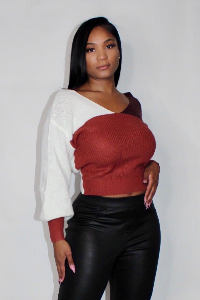 Loose fit color block sweater top with twisted open back.