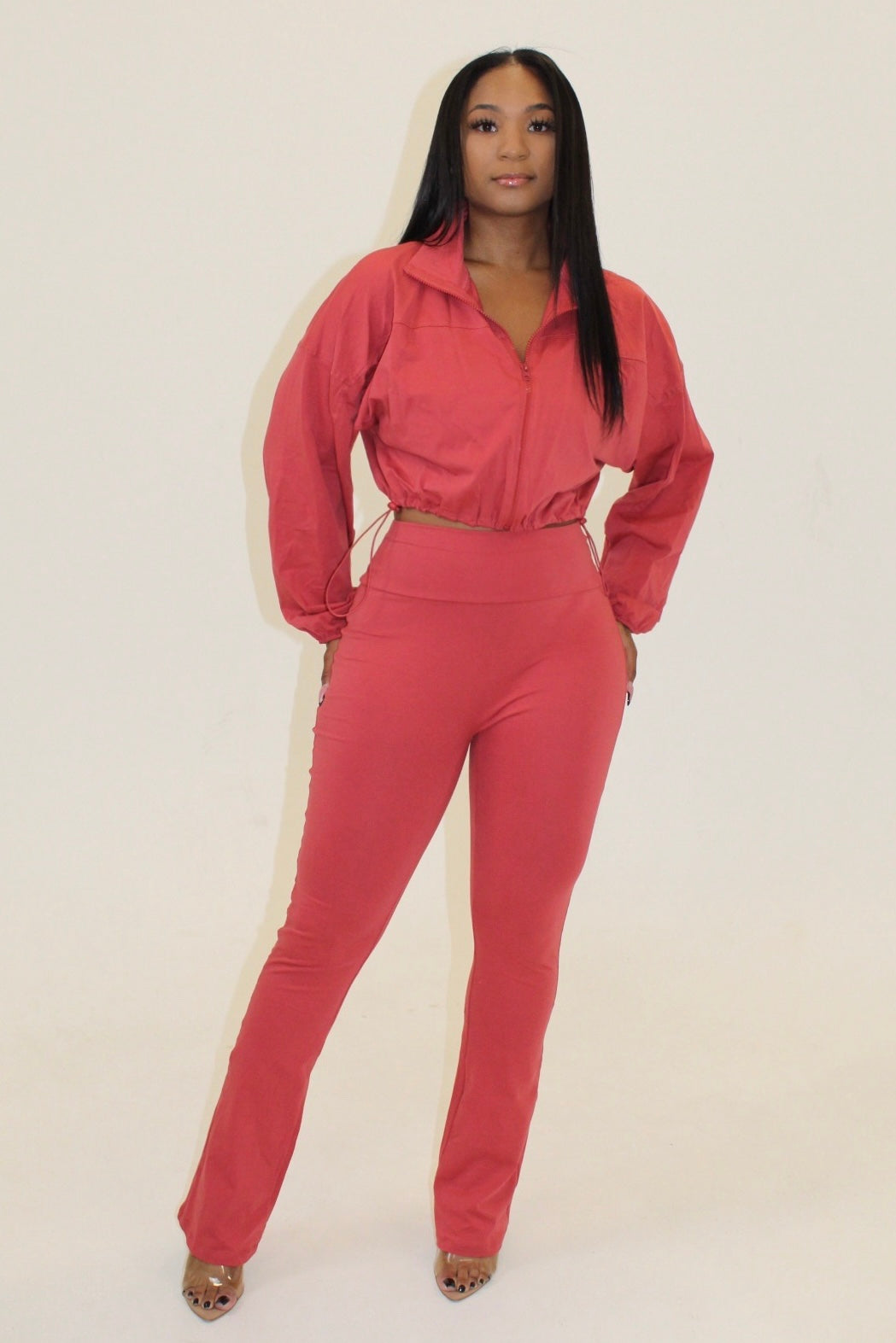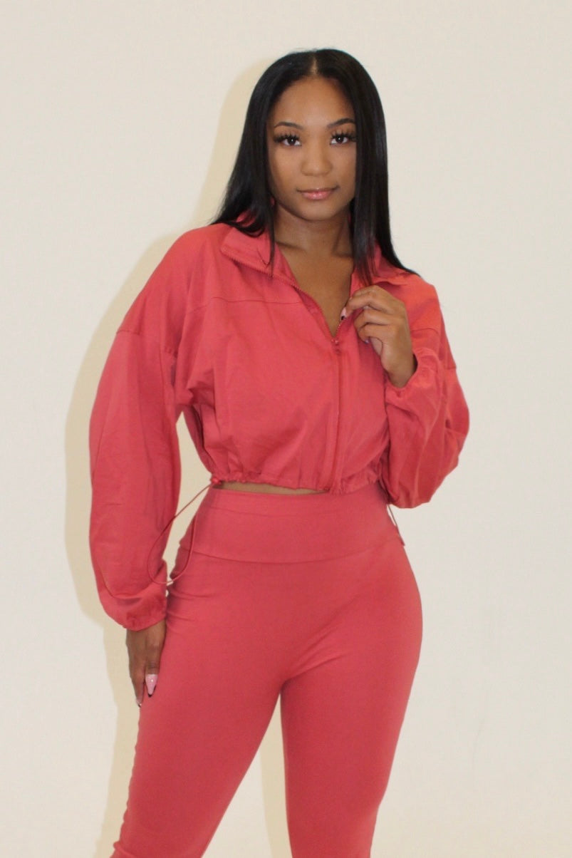 Two piece set with long sleeve cropped jacket and high waisted yoga pants. The jacket features pull ties for the perfect fit.
