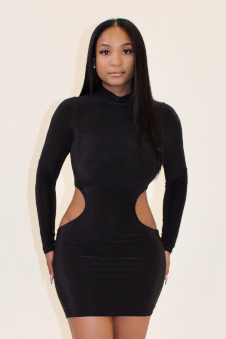 Long sleeve mock neck dress with side cutouts.